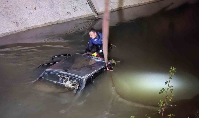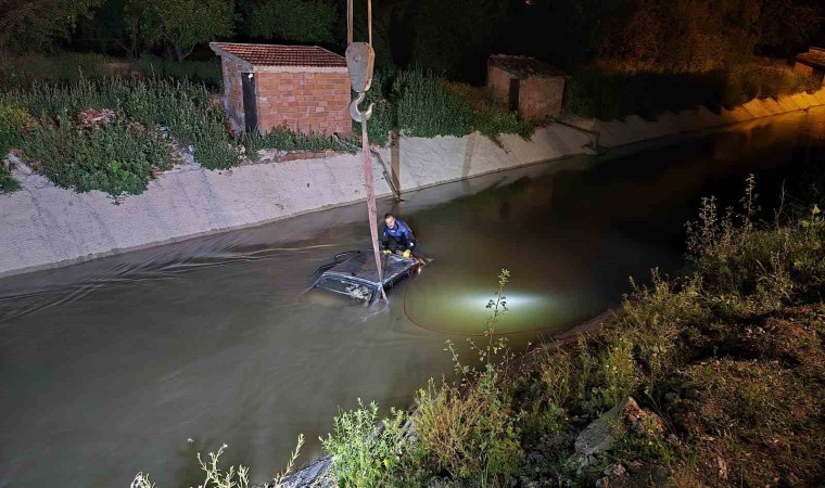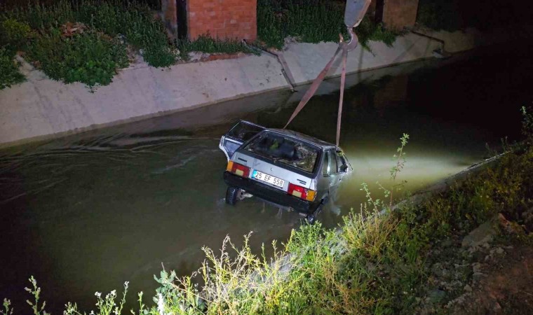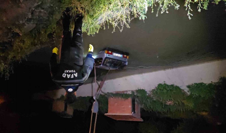 Tokat’ta kontrolden çıkarak sulama kanalına düşen otomobil vinç yardımıyla çıkartıldı.