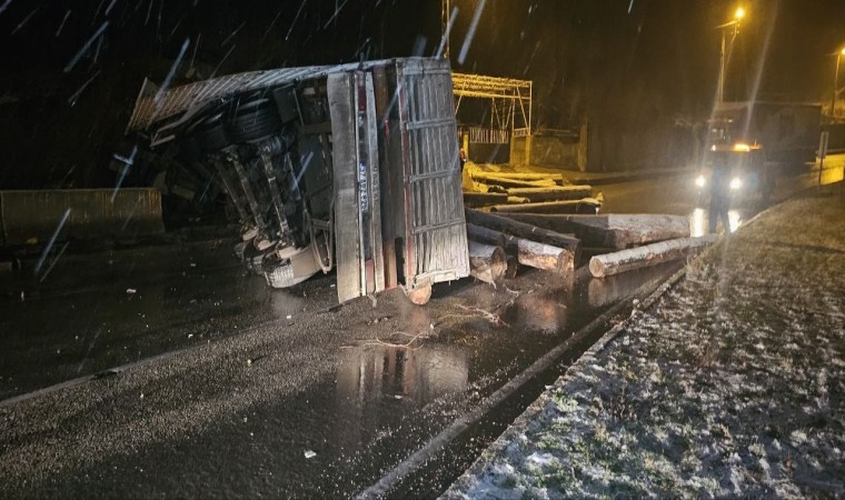 Tokat’ta etkili olan kar yağışı kazaya neden oldu. Çevre yolunda devrilen tomruk yüklü tır, yolun ulaşıma kapanmasına neden oldu.