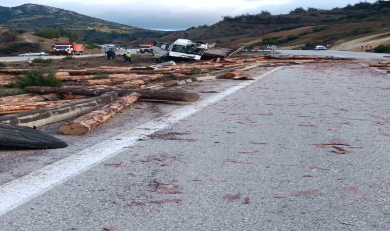 Balıkesir Dursunbey karayolunda meydana gelen kazada tomruk yüklü kamyon yoldan çıktı. Kazada kamyon sürücüsü hayatını kaybetti.