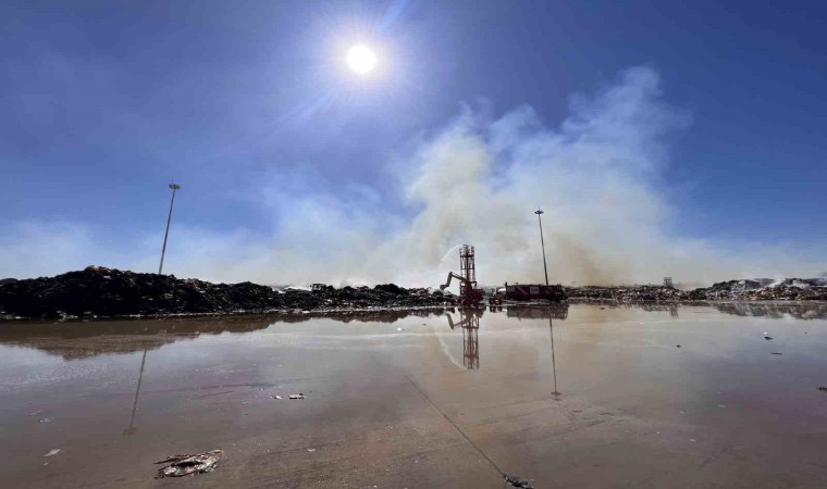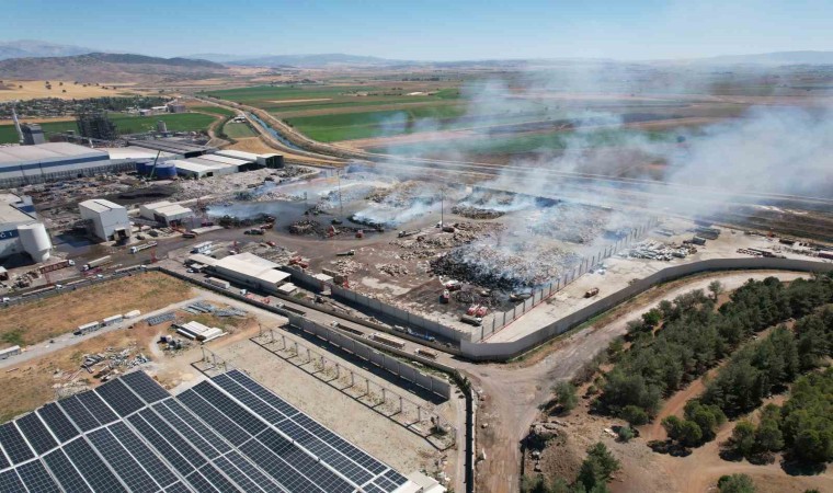 Fabrikanın atık toplama alanı dron kamerası ile görüntülendi. Alanda bulunan ekipler bir yandan soğutma işlemleri yaparken, bir yandan ise atık kağıt balyalarının taşındığı görüldü.