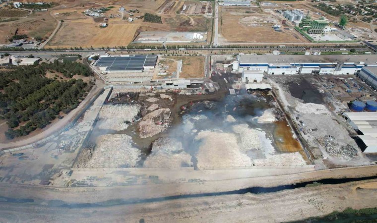 Kahramanmaraş’ta bir kağıt fabrikasının atık kağıt toplama alanında çıkan yangın sonrası devam eden soğutma işlemleri dron ile görüntülendi.