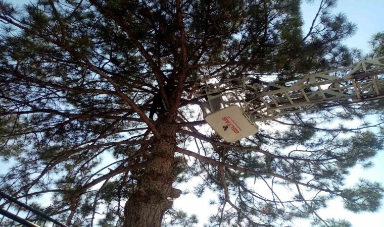 İtfaiyenin müdahale ettiği çocuk, inemediği ağaçtan kurtarıldı.