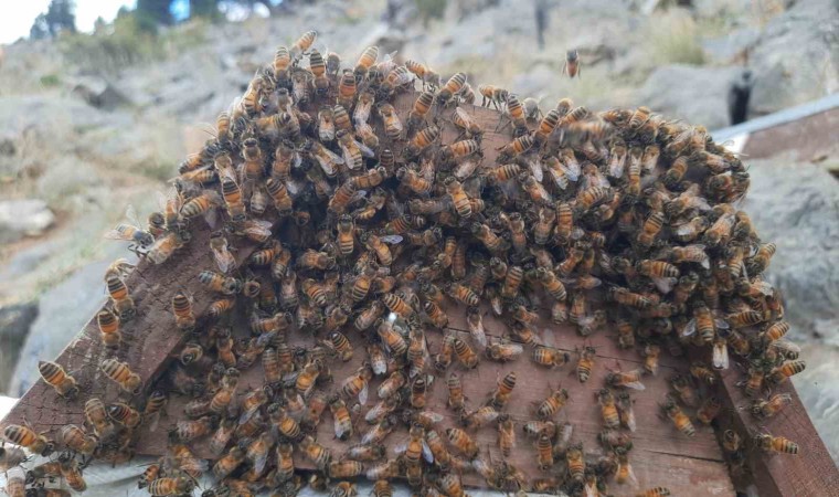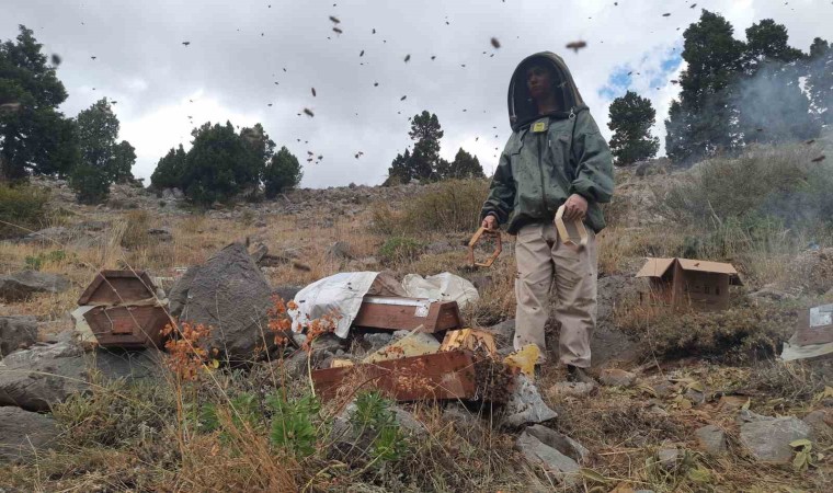 Konya’nın Bozkır ilçesinde Toros Dağlarının zirvelerindeki arılıklarda bulunan kovanlara ayı dadanınca ballar erken hasat edildi.