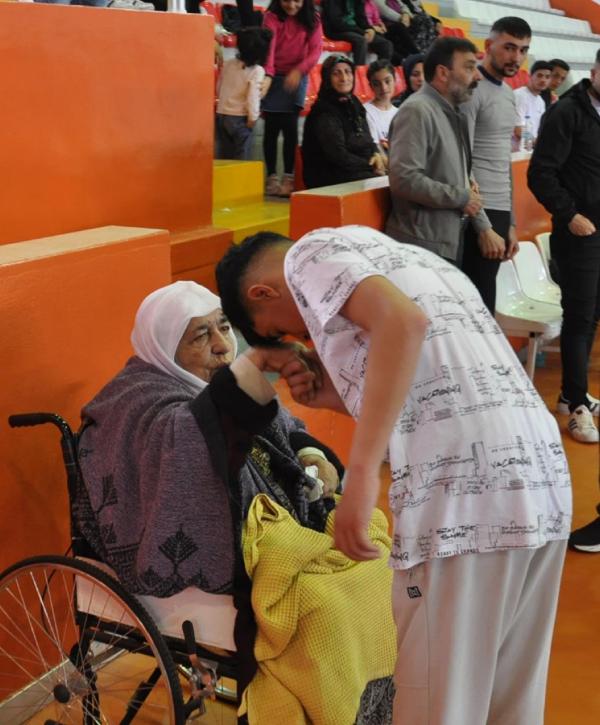 KARS, (DHA) - Karslı İnci Güngör (78), 19 Mayıs Atatürk'ü Anma Gençlik ve Spor Bayramı Boks Dostluk müsabakasına 14 yaş kategorisinde katılan torunu Efe'nin maçını izlemek için tekerlekli sandalyesiyle geldi. Rakibini mağlup eden Efe, kendisini izleyen ninesinin elini öperek sevincini paylaştı.
