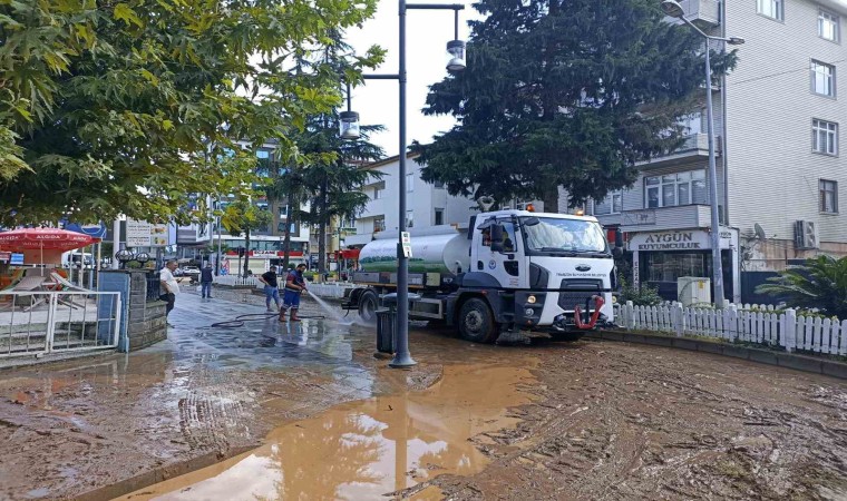 Trabzon’da son 24 saatte metrekareye 160 kilogram yağışın düştüğü, sel ve heyelanların yaşandığı Araklı, Arsin, Sürmene ve Yomra ilçelerinin cadde ve sokaklarında temizlik çalışmaları sürüyor.
