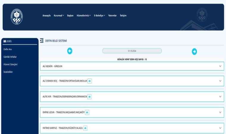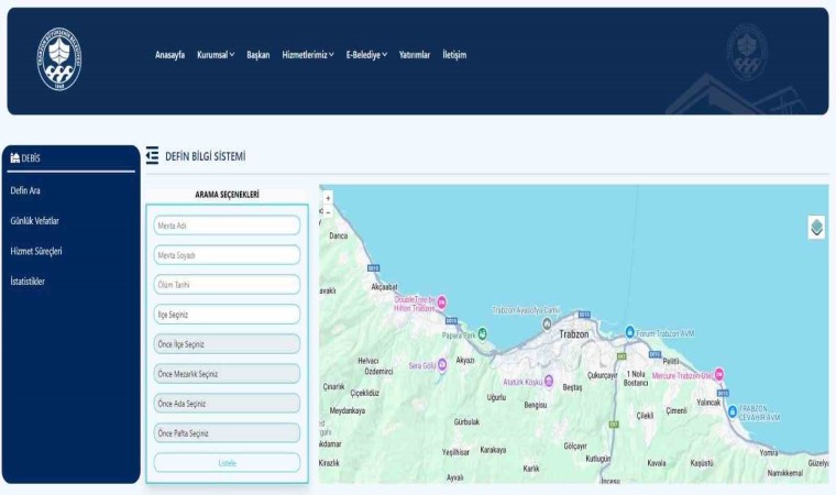Büyükşehir Belediyesi’nden yapılan açıklamada, “Mezarlık Bilgi Sistemi, vatandaşlarımıza kapsamlı bir hizmet sunarak, defin aramaları yapmanın yanı sıra günlük vefat bilgilerini ve cenaze namazlarının hangi camilerde kılınacağını, defin yerlerini detaylı bir şekilde öğrenme imkânı sağlamaktadır. Sistem, ayrıca vatandaşlarımızın vefat anında neler yapması gerektiğine dair bilgilendirici rehberlik sunarken, Trabzon Büyükşehir Belediyesi’nin sunduğu defin hizmetleri, cenaze yıkama, taziye ve benzeri hizmetlerden nasıl faydalanabileceklerine dair yönlendirmeler de sunmaktadır. Bununla birlikte, günlük defin hizmetlerine ilişkin yıkama, taziye ve defin işlemlerine dair istatistiki veriler de sistemde yer almakta olup, bu bilgiler kullanıcıların süreci daha kolay ve hızlı bir şekilde yönetmelerine olanak tanımaktadır. Sistem, cenaze sahiplerinin ihtiyaç duyduğu tüm bilgilere ulaşmasını kolaylaştırmaktadır” denildi.