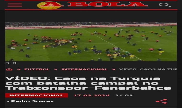 Portekiz A Bola gazetesi ise ’Kaos, saf kaos’ cümlelerine yer verdiği haberde, “Trabzonspor-Fenerbahçe karşılaşmasının son düdüğüyle, ev sahibi taraftarlar ve konuk takım oyuncuları arasında inanılmaz şiddet sahnelerine sahne oldu. Fenerbahçe karşılaşmayı 3-2 kazandı ve galibiyet golünü 87. dakikada Batshuayi kaydetti. Maçın bitiminden sonra Fenerbahçeliler, 3 puanı kazanmayı kutlamak için sahanın ortasında toplandı. İşte o zaman Trabzonspor taraftarları sahayı istila etmeye, rakip oyuncuları aramaya başladı ve oyun alanı, stadyumdaki yetkililerin önleyemediği gerçek bir meydan savaşına sahne oldu” diyerek okuyucularına olanları aktardı.