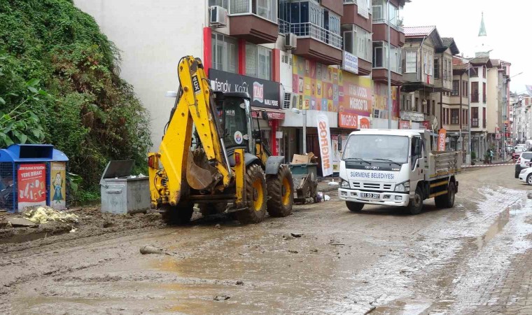 Trabzon’un Sürmene ilçesinde dün akşam yağan yoğun yağmur sonrası oluşan su baskınlarının ardından sular çekilirken, bugün temizleme çalışmaları devam ediyor.