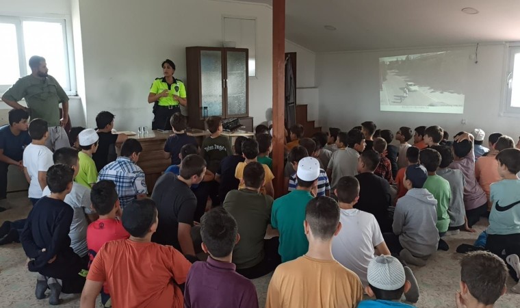 Düzce Trafik Denetme Şube Müdürlüğü ekiplerinin çocuklara yönelik eğitimleri devam ediyor. Ekipler 5 ayrı Kur’an kursunda 400 öğrenciye trafikte sürücü ve yolcuların yükümlülükleri, emniyet kemeri kullanımın önemi, trafikte yaya ve araç ile seyir halinde yapmaları gerekenler, yaya olarak taşıdıkları yükümlülükler ile trafik kurallarına uymanın önemi hakkında bilgilendirme yapılarak slayt sunumu ve kaza videoları şeklinde trafik eğitimi verildi.