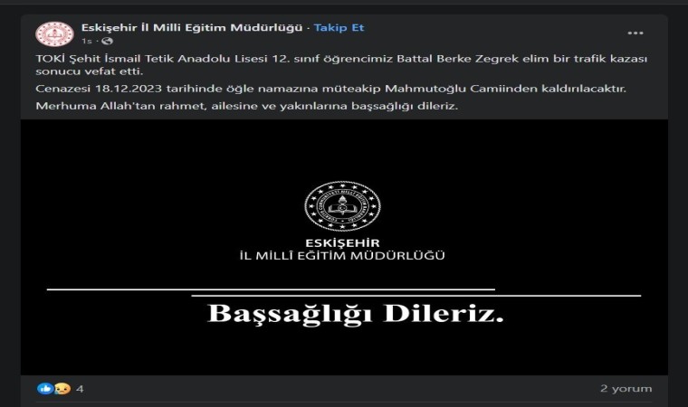 Dün sabah saatlerinde Odunpazarı ilçesi 71 Evler Mahallesi Yaşar Kemal Caddesi’nde meydana gelen trafik kazası sonucunda 26 AFV 558 plakalı sedan otomobilin sürücüsü Battal Berke Zegrek hayatını kaybetmiş, araçtaki yolcu konumunda bulunan 1’i ağır 3 kişi de yaralanmıştı. Kaza sonrasında Eskişehir İl Milli Eğitim Müdürlüğü sosyal medya hesaplarından taziye mesajı yayımladı. Mesajda şu ifadelere yer verildi;