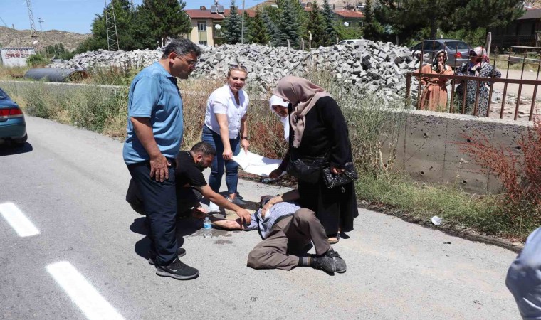 Sivas’ta vatandaşlar, trafik kazasında yaralanan yaşlı adamın sıcaktan etkilenmemesi için ambulans gelene kadar başında bez parçasıyla gölgelik yaparak beklediler.