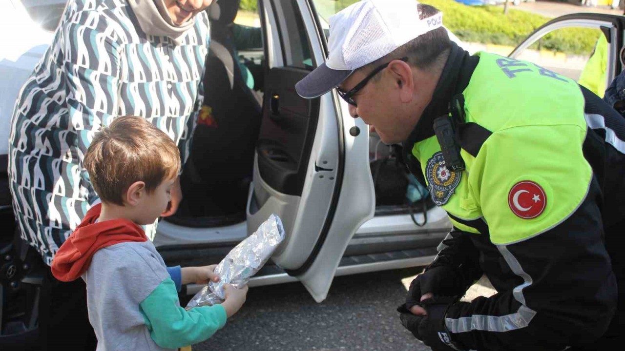 Trafik polisleri Marmaris girişinde sürücüleri uyardı, çocuklara hediye dağıttı