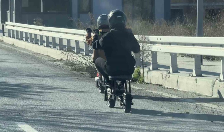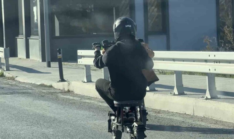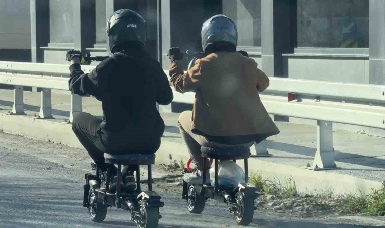 Her geçen gün kullanıcı sayısı artan elektrikli scooterlar trafikte araç sürücülerine zor zamanlar yaşatabiliyor. Kimi zaman E-5 karayolunda hız yaparken görülen scootorlar bu kez Gürpınar’da 2 kişinin tabure üzerinde oturarak kullanmasıyla görüldü. Sürücüler ve çevredekilerin şaşkın bakışları arasında tabureyi scooter üzerine koyup oturarak seyreden vatandaşlar trafiği de tehlikeye attı. Araçların hızında seyrederek diğer sürücüleri zor duruma sokan kişiler Gürpınar sahiline kadar seyrettikleri anlar kameraya yansıdı.