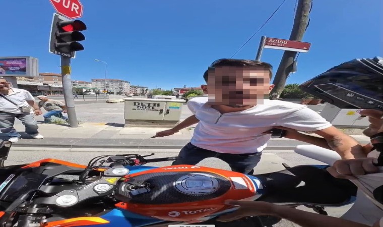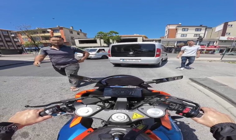 Olay, Ümraniye’de yaşandı. İddiaya göre, bir otomobil sürücüsü, trafikte tartıştığı motosiklet sürücüsünün kırmızı ışıkta durduğu sırada yanına gelerek küfretmeye başladı. Bu sırada yanında bulunan şahıs da bıçak çekerek motosikletli genci ‘Seni ikiye bölerim’ diye tehdit etti. Motosiklete vuran saldırgan, motosikletlinin de üzerine yürüdü. O anlar motosikletlinin kask kamerasına yansırken, kavga çevredekilerin müdahalesiyle son buldu.