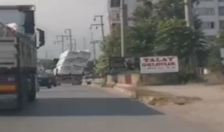 Edinilen bilgilere göre olay, Dörtyol ilçesi Özerli Mahallesi’nde meydana geldi. Mahallede bulunan Mustafa Kemal Duduoğlu Bulvarı üzerinde tehlikeli yük taşıyan tır, trafikteki sürücüleri tedirgin etti. Trafikte paniğe neden olan tırın o anları, bir vatandaşın cep telefonu kamerasıyla görüntülendi. Görüntülerde; tırın üzerindeki yükün yan yatmış bir şekilde taşındığı kameraya yansıdı. Sosyal medyadan yayılan görüntülerin ardından Dörtyol Emniyet Müdürlüğüne bağlı Trafik Şube Müdürlüğü ekipleri harekete geçti. Görüntüleri inceleyen ekipler, tehlikeli yükle yolculuk yapan tırın sürücüsüne bin 440 TL para cezası uyguladı.