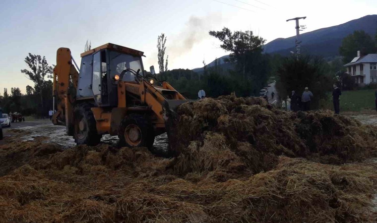 Yangın sebebiyle trafiğe kapatılan yolda, jandarma ekipleri tarafından kontrolü geçişler sağladı. Küle dönen saman balyaları kepçe vasıtasıyla yoldan kaldırıldı. Jandarma olay yerinde inceleme başlattı.