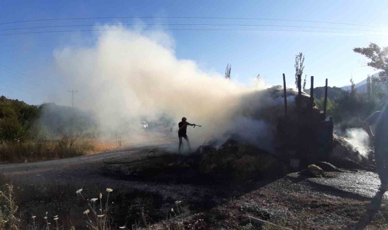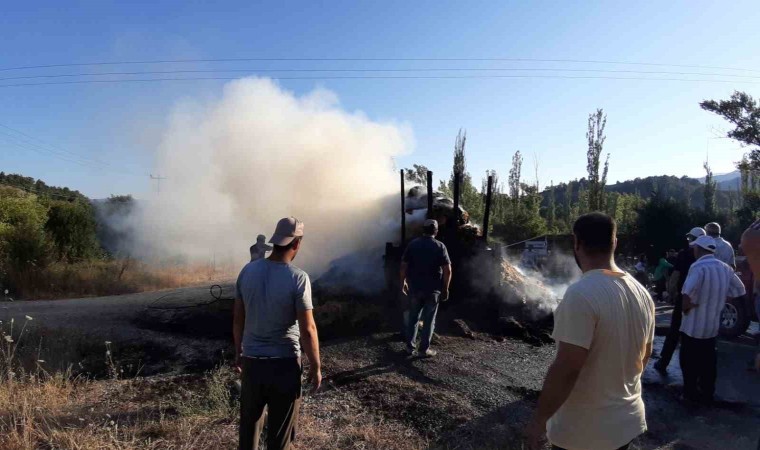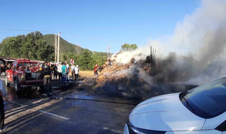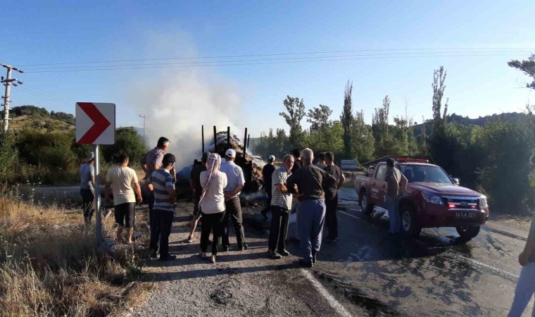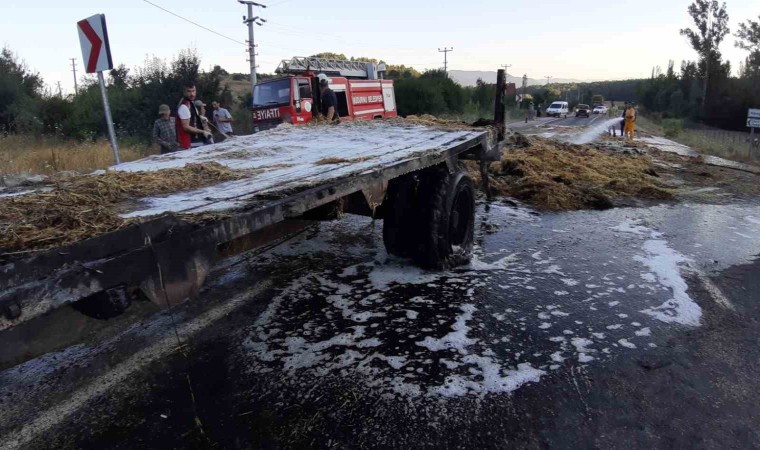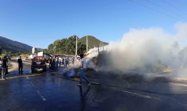 Bolu’nun Mudurnu ilçesinde seyir halindeki traktörün römork kısmında çıkan yangında, 110 saman balyası küle döndü.