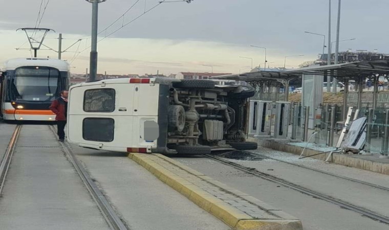 Eskişehir’de sürücüsünün direksiyon hâkimiyetini kaybetmesi sonucunda tramvay yolunda devrilen minibüs seferlerinin aksamasına neden oldu.