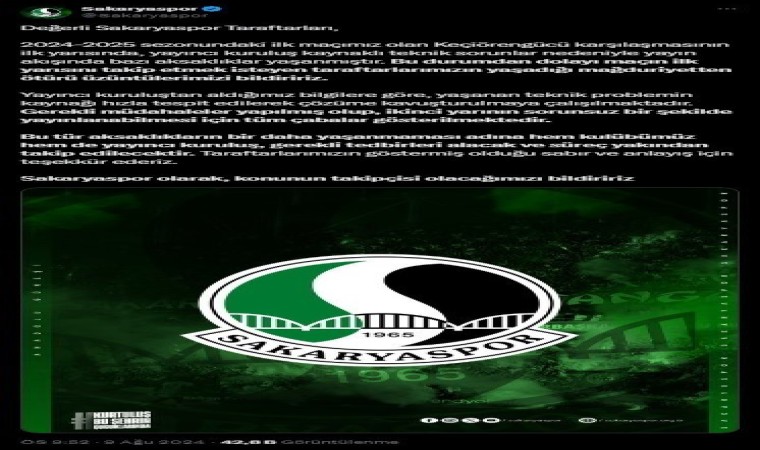Trendyol 1. Lig 2024-2025 sezonunun açılış maçında Sakaryaspor, Pendik Stadyumu’nda Ankara Keçiörengücü ile karşı karşıya geldi. Yayıncı kuruluş kaynaklı yaşanan teknik sorunlar sebebi ile maçın ilk yarısının yayını cep telefonundan yapıldı. Maçı izlemek için televizyon başına geçen taraftarlar ise yaşanan duruma tepkilerini sosyal medyadan yaptıkları paylaşımlar ile dile getirdi. Sakaryaspor, konuya ilişkin sosyal medya hesabından yaptığı açıklamada, “Değerli Sakaryaspor taraftarları, 2024-2025 sezonundaki ilk maçımız olan Keçiörengücü karşılaşmasının ilk yarısında, yayıncı kuruluş kaynaklı teknik sorunlar nedeniyle yayın akışında bazı aksaklıklar yaşanmıştır. Bu durumdan dolayı maçın ilk yarısını takip etmek isteyen taraftarlarımızın yaşadığı mağduriyetten ötürü üzüntülerimizi bildiririz. Yayıncı kuruluştan aldığımız bilgilere göre, yaşanan teknik problemin kaynağı hızla tespit edilerek çözüme kavuşturulmaya çalışılmaktadır. Gerekli müdahaleler yapılmış olup, ikinci yarının sorunsuz bir şekilde yayınlanabilmesi için tüm çabalar gösterilmektedir. Bu tür aksaklıkların bir daha yaşanmaması adına hem kulübümüz hem de yayıncı kuruluş, gerekli tedbirleri alacak ve süreç yakından takip edilecektir. Taraftarlarımızın göstermiş olduğu sabır ve anlayış için teşekkür ederiz. Sakaryaspor olarak, konunun takipçisi olacağımızı bildiririz” ifadelerine yer verdi.