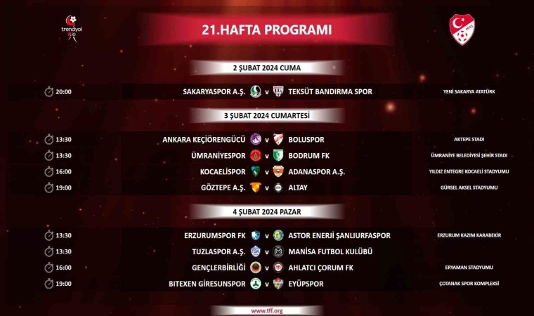 Türkiye Futbol Federasyonu, Trendyol 1. Lig’in 21 ve 22. hafta müsabaka programını duyurdu. TFF resmi internet sitesinden yapılan açıklamaya göre 1. Lig’de 21 ve 22. haftanın karşılaşma programları şu şekilde: