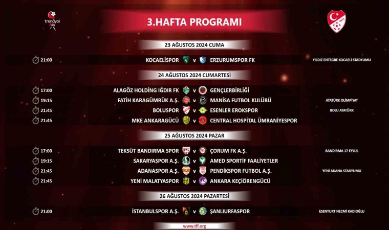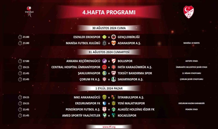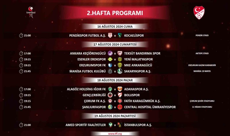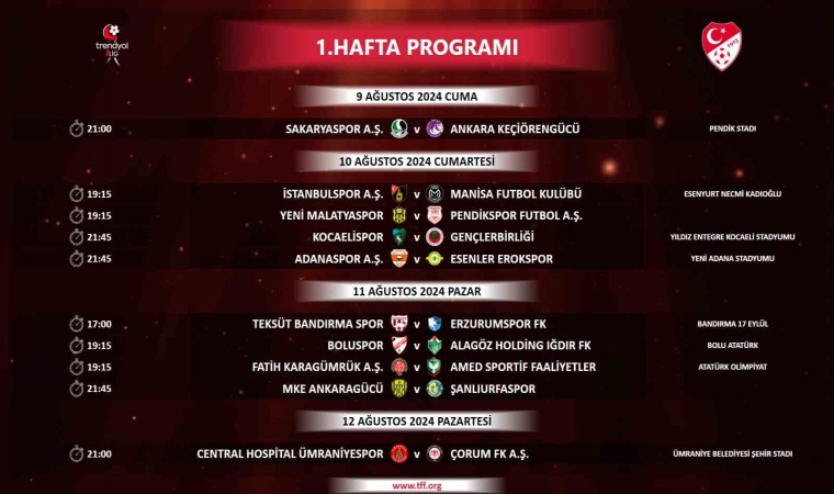 Trendyol 1. Lig’de ilk 5 haftanın programı şöyle: