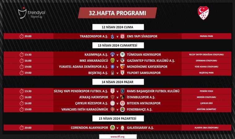 Türkiye Futbol Federasyonu, Trendyol Süper Lig’in 32. haftasının müsabaka programını duyurdu. TFF’nin resmi internet sitesinden yapılan açıklamaya göre, Süper Lig’de 32. haftanın programı şu şekilde: