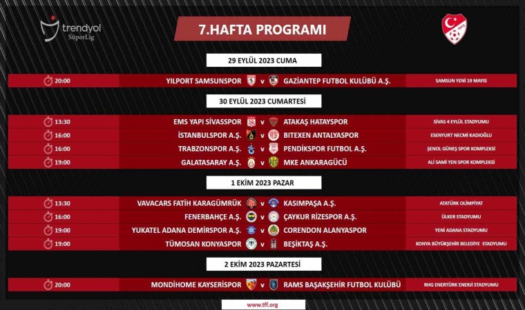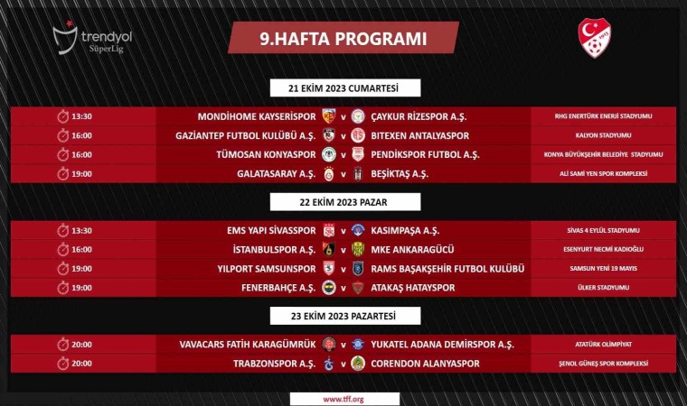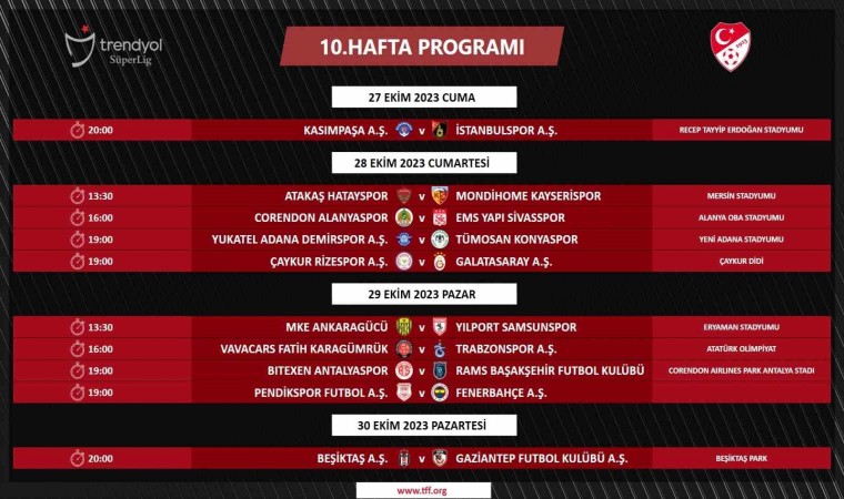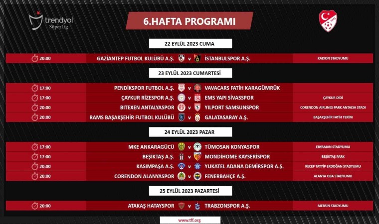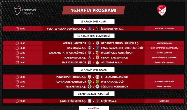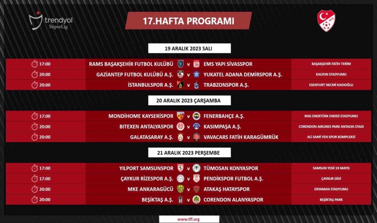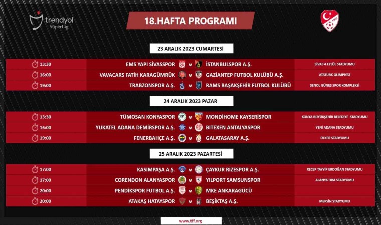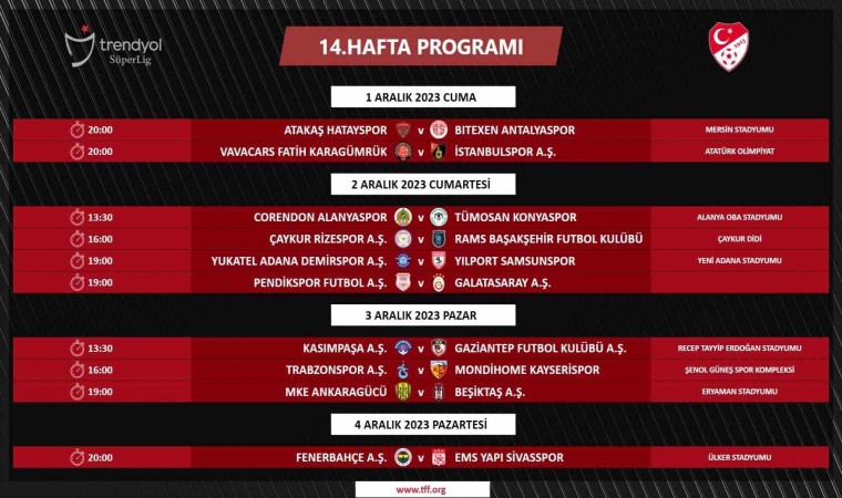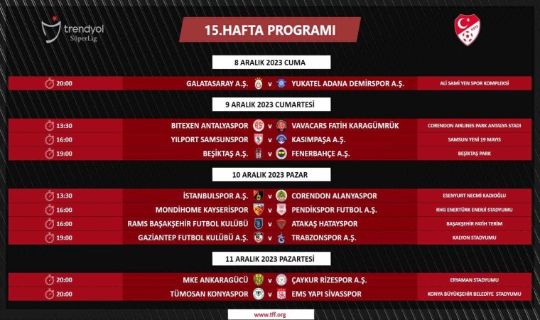 Süper Lig’de 5-18. haftalarda oynanacak müsabakaların programı şu şekilde:
