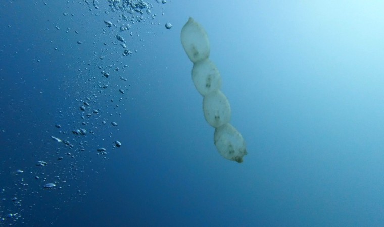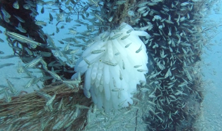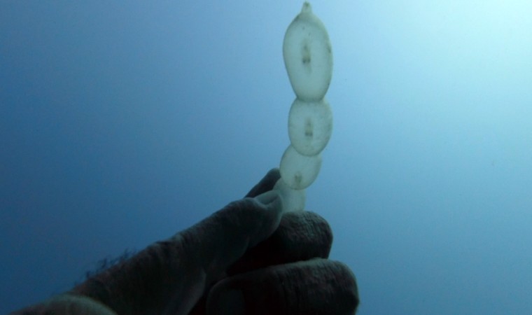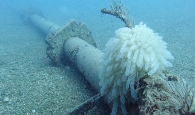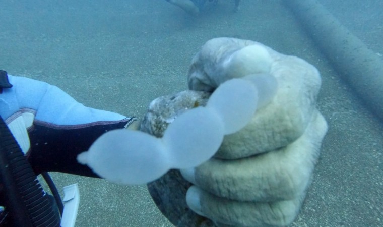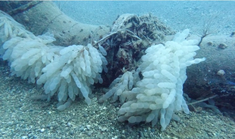Prof. Dr. Mehmet Gökoğlu, “Konyaaltı Sahili’nde karşılaştığımız yumurtalar, kalamar yumurtaları. Kalamarlar yumurtalarını yerden yükselen objelere bırakır, iple temas ettirmemeye çalışır. Yumurtalar, bıraktığı yerde şeffaf eldivenin parmağı şeklinde boğum boğumdur. Her bir boğumun içinde bir larva var, hareketli larvalar. Açılmaya doğru daha da belirginleşiyor, yumurta şişiyor, belli büyüklüğe geldikten sonra larva o yumurtayı delip çıkıyor. Bir enzim salgılıyor, yumurtadan çıkıyor, yavru kalamar olarak doğaya katılıyor” diye konuştu.