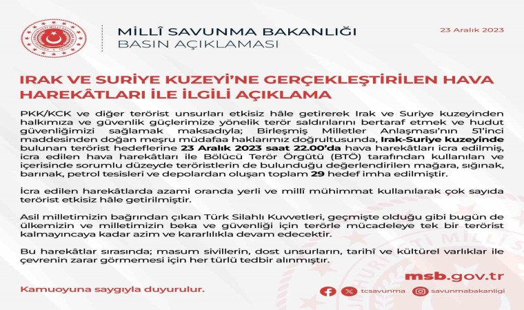 “PKK/KCK ve diğer terörist unsurları etkisiz hale getirerek Irak ve Suriye kuzeyinden halkımıza ve güvenlik güçlerimize yönelik terör saldırılarını bertaraf etmek ve hudut güvenliğimizi sağlamak maksadıyla; Birleşmiş Milletler Anlaşması’nın 51’inci maddesinden doğan meşru müdafaa haklarımız doğrultusunda, Irak-Suriye kuzeyinde bulunan terörist hedeflerine 23 Aralık 2023 saat 22.00’da hava harekatları icra edilmiş, icra edilen hava harekatları ile bölücü terör örgütü tarafından kullanılan ve içerisinde sorumlu düzeyde teröristlerin de bulunduğu değerlendirilen mağara, sığınak, barınak, petrol tesisleri ve depolardan oluşan toplam 29 hedef imha edilmiştir. İcra edilen harekatlarda azami oranda yerli ve milli mühimmat kullanılarak çok sayıda terörist etkisiz hale getirilmiştir. Asil milletimizin bağrından çıkan Türk Silahlı Kuvvetleri, geçmişte olduğu gibi bugün de ülkemizin ve milletimizin beka ve güvenliği için terörle mücadeleye tek bir terörist kalmayıncaya kadar azim ve kararlılıkla devam edecektir.