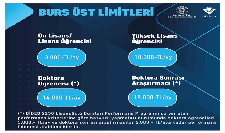 Ayrıca, BİDEB 2250 Lisansüstü Bursları Performans Programı kapsamında doktora öğrencileri 5 bin TL'ye, doktora sonrası araştırmacılar ise 6 bin TL'ye kadar performans ödemesi alabilecek.