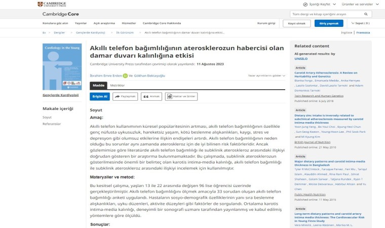 Sakarya’nın Adapazarı ilçesinde özel bir lisede 12’nci sınıf öğrencisi olan İbrahim Emre Erden’in, akıllı telefon bağımlılığı ile subklinik ateroskleroz (damar kalınlığı) arasındaki ilişkiyi incelediği ve TÜBİTAK’ın elediği proje, Dünyadaki en eski yayınevi ve en saygın akademik yayıncılar arasında yer alan Cambridge University Press’te yayımlandı.