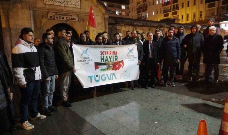 Çapanoğlu Büyük Cami’de kılınan yatsı namazının ardından cami önünde açıklamalarda bulunan Türkiye Gençlik Vakfı (TÜGVA) Yozgat İl Temsilcisi Ubeydullah Şahan, ABD’nin Gazze’de insani ateşkes önerisini reddetmesine yönelik basın açıklaması yaptı.