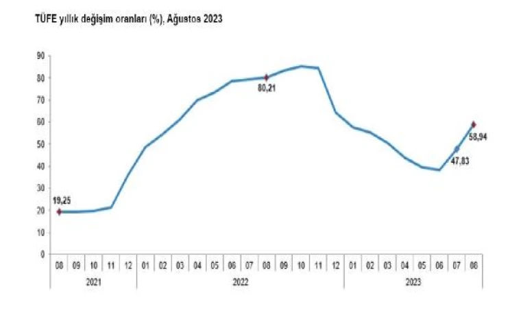 TÜİK, Ağustos 2023 dönemine ilişkin enflasyon oranlarını açıkladı. Buna göre; tüketici enflasyonuna işaret eden tüketici fiyat endeksindeki (TÜFE) değişim, bir önceki aya göre yüzde 9,09, bir önceki yılın aralık ayına göre yüzde 43,06, bir önceki yılın aynı ayına göre yüzde 58,94 ve 12 aylık ortalamalara göre yüzde 56,28 olarak gerçekleşti.