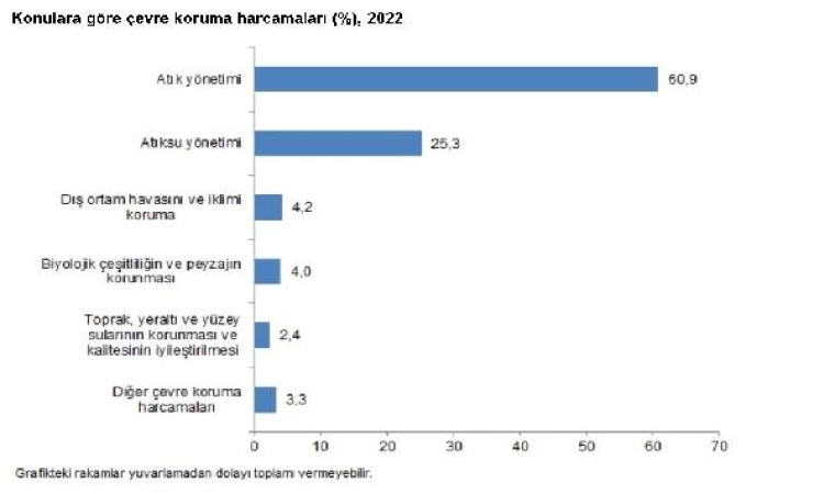 Çevre koruma harcamalarının, yüzde 60,9'u atık yönetimi hizmetlerinden, yüzde 25,3'ü atıksu yönetimi hizmetlerinden, yüzde 4,2'si dış ortam havasını ve iklimi korumadan, yüzde 4'ü biyolojik çeşitliliğin ve peyzajın korunmasından, yüzde 2,4'ü toprak, yer altı ve yüzey sularının korunması ve kalitesinin iyileştirilmesinden, yüzde 3,3'ü ise diğer çevre koruma konularından oluştu.