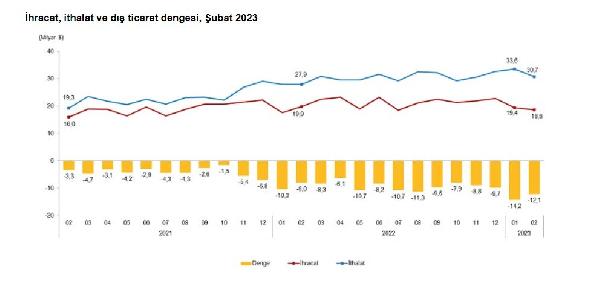 Şubat ayında dış ticaret açığı bir önceki yılın aynı ayına göre yüzde 51,4 artarak 12 milyar 79 milyon dolara yükseldi. 2023 Şubat ayında ihracatın ithalatı karşılama oranı yüzde 60,7'ye gerileyerek, 2022 Şubat ayındaki yüzde 71,4 seviyesinin altına indi. 2023 Ocak-Şubat döneminde dış ticaret açığı, önceki yılın aynı dönemine göre yüzde 44,1 artarak 26 milyar 328 milyon dolara çıktı. Bu dönemde ihracatın ithalatı karşılama oranı ise yüzde 59,1 olarak kaydedildi.