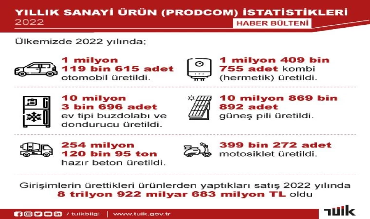 TÜİK, 2022 yılına ilişkin sanayi ürün istatistiklerini açıkladı. Buna göre; Türkiye'de 2022 yılında 1 milyon 119 bin 615 otomobil, 10 milyon 3 bin 696 ev tipi buzdolabı ve dondurucu, 254 milyon 120 bin 95 ton hazır beton, 1 milyon 409 bin 755 kombi (hermetik), 10 milyon 869 bin 892 güneş pili ve 399 bin 272 motosiklet üretildi.