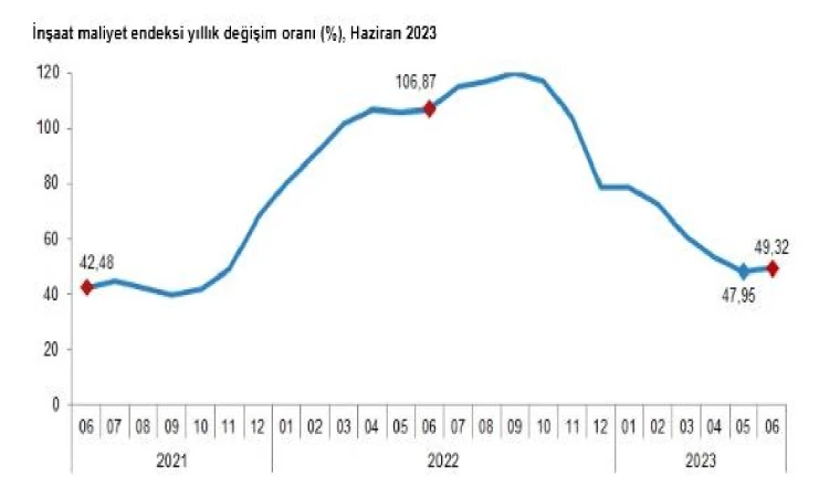 TÜİK, Haziran 2023 dönemine ilişkin inşaat maliyet endeksi verilerini açıkladı. Buna göre; inşaat maliyetlerinde, endeks bir önceki aya göre yüzde 4,43, bir önceki yılın aynı ayına göre yüzde 49,32 arttı. Aylık değerlendirmede malzeme endeksi yüzde 5,81, işçilik endeksi yüzde 0,86 arttı. Yıllık değerlendirmede malzeme endeksi yüzde 35,67, işçilik endeksi yüzde 105,11 arttı.