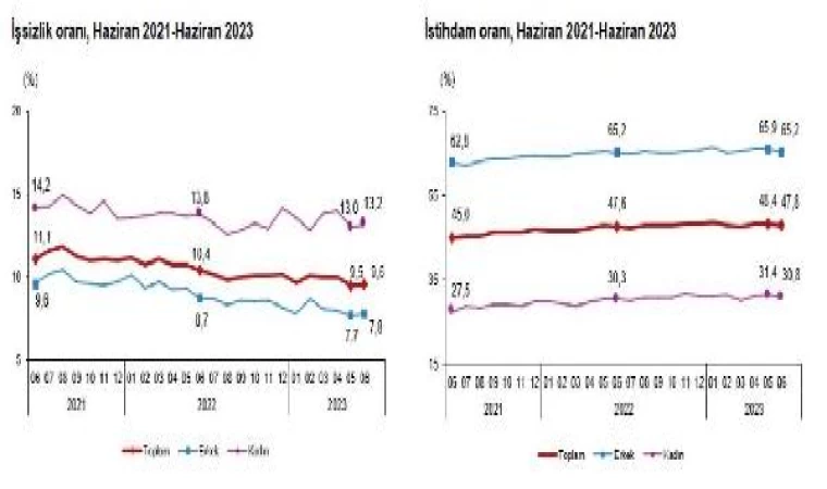 TÜİK, Haziran 2023 dönemine ilişkin işgücü istatistiklerini açıkladı. Buna göre; 15 ve daha yukarı yaştaki kişilerde işsiz sayısı, haziranda bir önceki aya göre 2 bin kişi artarak 3 milyon 337 bin kişi oldu. İşsizlik oranı 0,1 puan artarak yüzde 9,6 seviyesinde gerçekleşti. İşsizlik oranı, erkeklerde yüzde 7,8, kadınlarda yüzde 13,2 kaydedildi. İstihdam edilenlerin sayısı, bir önceki aya göre 363 bin kişi azalarak 31 milyon 291 bin kişi, istihdam oranı ise 0,6 puan azalarak yüzde 47,8 oldu. Oran erkeklerde yüzde 65,2, kadınlarda yüzde 30,8 olarak gerçekleşti. İşgücü ise bir önceki aya göre 359 bin kişi azalarak 34 milyon 629 bin kişi oldu. İşgücüne katılma oranı 0,6 puan azalarak yüzde 52,9 seviyesine indi. İşgücüne katılma oranı erkeklerde yüzde 70,7'yken kadınlarda yüzde 35,5 oldu.