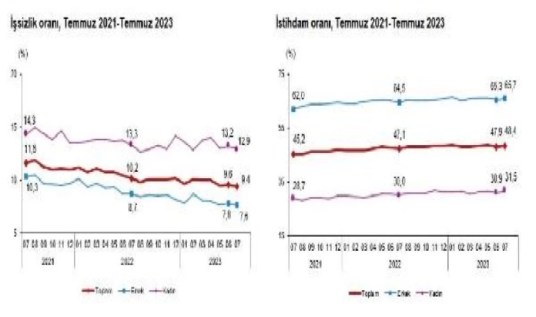 TÜİK, Temmuz 2023 dönemine ilişkin işgücü istatistiklerini açıkladı. Buna göre; 15 ve daha yukarı yaştaki kişilerde işsiz sayısı, temmuz ayında bir önceki aya göre 38 bin kişi azalarak 3 milyon 291 bin kişi oldu. İşsizlik oranı, 0,2 puan azalarak yüzde 9,4 seviyesinde gerçekleşti. İşsizlik oranı erkeklerde yüzde 7,6, kadınlarda yüzde 12,9 kaydedildi. İstihdam edilenlerin sayısı da önceki aya göre 318 bin kişi artarak 31 milyon 671 bin kişi, istihdam oranı 0,5 puan artarak yüzde 48,4 oldu. İstihdam oranı, erkeklerde yüzde 65,7, kadınlarda yüzde 31,5 şeklinde gerçekleşti. İşgücü, bir önceki aya göre 280 bin kişi artarak 34 milyon 962 bin kişi, işgücüne katılma oranı 0,4 puan artarak yüzde 53,4 olarak gerçekleşti. İşgücüne katılma oranı erkeklerde yüzde 71,1, kadınlarda yüzde 36,1.