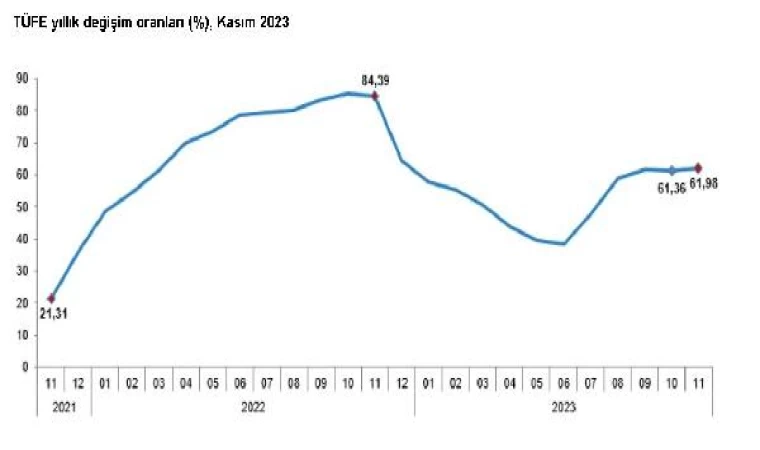 TÜİK, Kasım 2023 dönemine ilişkin enflasyon verilerini açıkladı. Buna göre; tüketici enflasyonuna işaret eden tüketici fiyat endeksi (TÜFE), kasımda yıllık yüzde 61,98, aylık yüzde 3,28 arttı. Bir önceki yılın aralık ayına göre yüzde 60,09, 12 aylık ortalamaya göre yüzde 53,40 arttı. TÜFE'nin geçen ay yıllık yüzde 61,36, aylık yüzde 3,43 arttığı açıklanmıştı.