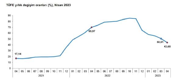 TÜİK, Nisan 2023 dönemine ilişkin enflasyon verilerini açıkladı. Buna göre; tüketici enflasyonuna işaret eden tüketici fiyat endeksindeki (TÜFE) değişim, nisan ayında bir önceki aya göre yüzde 2,39, bir önceki yılın aralık ayına göre yüzde 15,21, bir önceki yılın aynı ayına göre yüzde 43,68 ve 12 aylık ortalamalara göre yüzde 67,20 olarak gerçekleşti.