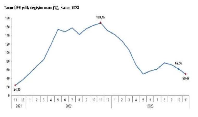 TÜİK, Kasım 2023 dönemine ilişkin tarım üretici enflasyonuna işaret eden Tarım-ÜFE verilerini açıkladı. Buna göre; ekimde yıllık yüzde 62,56 arttığı, aylık yüzde 1,13 azaldığı açıklanan Tarım-ÜFE, kasım ayıda yıllık yüzde 50,47 arttı, aylık yüzde 0,95 azaldı.