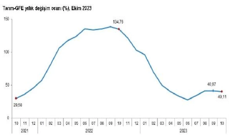 TÜİK, Ekim 2023 dönemine ilişkin Tarım-GFE verilerini açıkladı. Buna göre; Tarım-GFE'de ekim ayında bir önceki aya göre yüzde 2,06, bir önceki yılın aralık ayına göre yüzde 35,87, bir önceki yılın aynı ayına göre yüzde 40,11 ve 12 aylık ortalamalara göre yüzde 51,53 artış gerçekleşti.