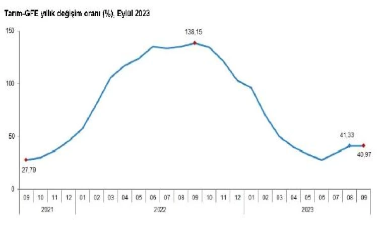 TÜİK, Eylül 2023 dönemine ilişkin ilişkin Tarım-GFE verilerini açıkladı. Buna göre; endeks eylülde bir önceki aya oranla yüzde 2,63, geçen yılın aralık ayına göre yüzde 33,13, geçen yılın aynı ayına göre yüzde 40,97 ve 12 aylık ortalamalara göre yüzde 56,87 yükseldi. Ana gruplarda bir önceki aya göre; tarımda kullanılan mal ve hizmet endeksinde yüzde 2,36, tarımsal yatırıma katkı sağlayan mal ve hizmet endeksinde yüzde 4,31 artış oldu. Geçen yılın aynı ayına göre; tarımda kullanılan mal ve hizmet endeksinde yüzde 35,8, tarımsal yatırıma katkı sağlayan mal ve hizmet endeksinde yüzde 81,65 artış gerçekleşti.