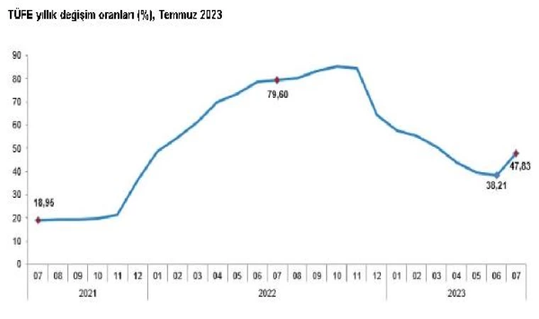 TÜİK, Temmuz 2023 dönemine ilişkin enflasyon oranlarını açıkladı. Buna göre; tüketici enflasyonuna işaret eden tüketici fiyat endeksindeki (TÜFE) değişim, bir önceki aya göre yüzde 9,49, bir önceki yılın aralık ayına göre yüzde 31,14, bir önceki yılın aynı ayına göre yüzde 47,83 ve 12 aylık ortalamalara göre yüzde 57,45 olarak gerçekleşti.