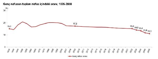 TÜİK, 2022 yılına ilişkin gençlik istatistiklerini açıkladı. Buna göre; 2022 sonu itibarıyla Türkiye'nin toplam nüfusu 85 milyon 279 bin 553 kişiyken; 15-24 yaş grubundaki genç nüfus 12 milyon 949 bin 817 kişi oldu. Genç nüfus, toplam nüfusun yüzde 15,2'sini oluşturdu. Genç nüfusun yüzde 51,2'sini erkek, yüzde 48,8'ini kadın nüfus oluşturdu. Genç nüfus oranının en yüksek olduğu iller, yüzde 22 ile Hakkari, yüzde 21,7 ile Şırnak ve yüzde 21,1 ile Siirt oldu. En düşük olduğu iller ise yüzde 12,3 ile Muğla ve Balıkesir, yüzde 12,7 ile Ordu, yüzde 12,8 ile Tunceli, Sinop ve Kırklareli oldu. Nüfus projeksiyonlarına göre; genç nüfusun toplam nüfus içindeki oranının 2030 yılında yüzde 14, 2040 yılında yüzde 13,4, 2060 yılında yüzde 11,8 ve 2080 yılında yüzde 11,1'e düşeceği öngörüldü.