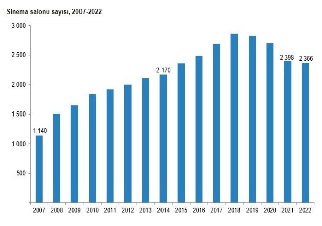 Türkiye İstatistik Kurumu (TÜİK), Sinema ve Gösteri Sanatları İstatistikleri'ni açıkladı. 2022 yılında Türkiye genelinde sinema salonu sayısı bir önceki yıla göre yüzde 1,3 azalarak 2 bin 366 olarak kaydedildi. Sinema salonlarındaki koltuk sayısı da yüzde 0,3 azalarak 284 bin 204 olarak belirlendi.