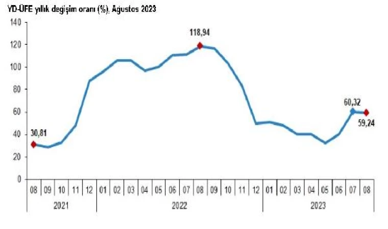 TÜİK, Ağustos 2023 dönemine ilişkin yurt dışı üretici enflasyonuna işaret eden yurt dışı üretici fiyat endeksi (YD-ÜFE) verilerini açıkladı. Buna göre; temmuz ayında yıllık yüzde 60,32, aylık yüzde 15,34 arttığı açıklanan YD-ÜFE, ağustosta aylık yüzde 1,95, yıllık yüzde 59,24 arttı.