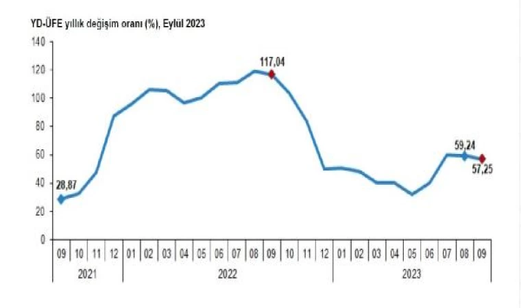 TÜİK, Eylül 2023 dönemine ilişkin yurt dışı üretici enflasyonuna işaret eden yurt dışı üretici fiyat endeksi (YD-ÜFE) verilerini açıkladı. Buna göre; ağustos ayında yıllık yüzde 59,24, aylık yüzde 1,95 arttığı açıklanan YD-ÜFE, eylülde aylık 0,59 azaldı; yıllık yüzde 57,25 arttı.