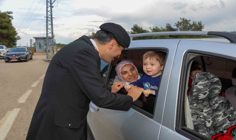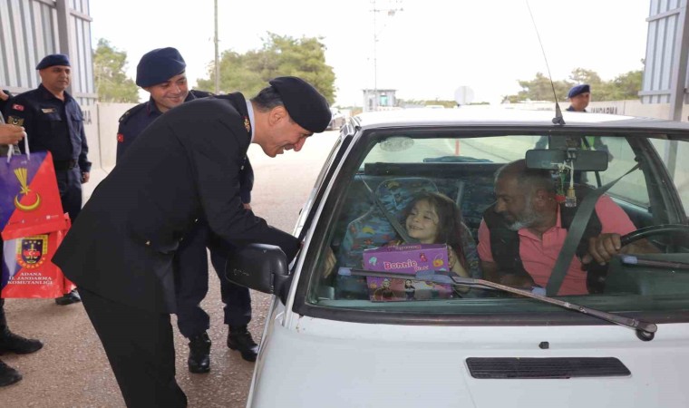 Adana İl Jandarma Komutanı Tümgeneral, Coşkun Sel, uygulama noktalarını denetleyerek, durdurulan araçlardaki çocuklara şeker ve hediye verdi.